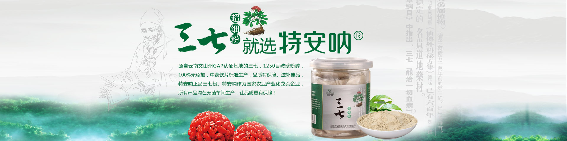 云南特安吶制藥股份有限公司(以下簡稱“公司”)成立于1994年5月。2015年7月,云南省康旅控股集團有限公司旗下的云南三七科技有限公司増資擴股,公司成為立足文山、專注三七開發的國有控股企業。公司成立以來,緊緊依托文山得天獨厚的三七資源優勢,全力打造三七產業。經過近30年的發展,公司構建了以“產品研發基地、三七GAP種植基地、中藥材加工基地、產品生產基地、物流倉儲基地”和“三七國際交易...